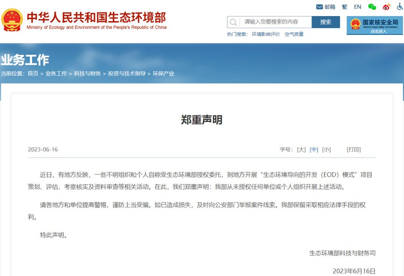 6月16日,生态环境部发布郑重声明称,近日,有地方反映,一些不明组织和个人自称受生态环境部授权委托,到地方开展“生态环境导向的开发(EOD)模式”项目策划、评估、考察核实及资料审查等相关活动。生态环境部郑重声明,该部从未授权任何单位或个人组织开展上述活动。