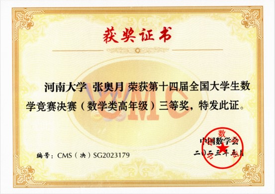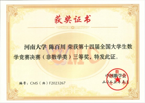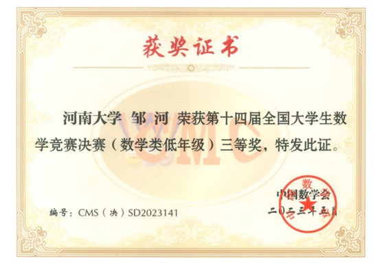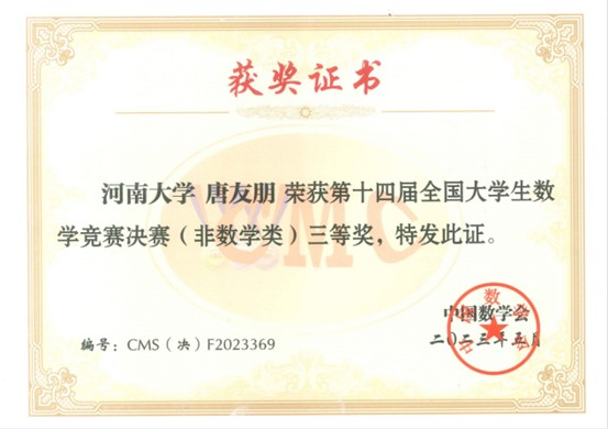 人工智能学院陈百川和计算机与信息工程学院唐友朋分别获得非专业组三等奖,河南省数学会获评“优秀组织奖”