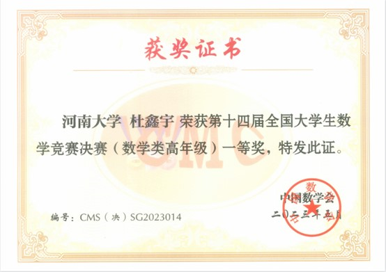 数学与统计学院2020级数学与应用数学专业“明德计划”实验班(简称实验班)杜鑫宇以河南省第一名的好成绩获得专业组(高年级组)一等奖