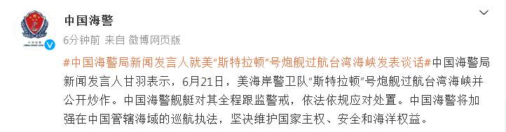 中国海警局新闻发言人甘羽表示,6月21日,美海岸警卫队“斯特拉顿”号炮舰过航台湾海峡并公开炒作。中国海警舰艇对其全程跟监警戒,依法依规应对处置。中国海警将加强在中国管辖海域的巡航执法,坚决维护国家主权、安全和海洋权益。