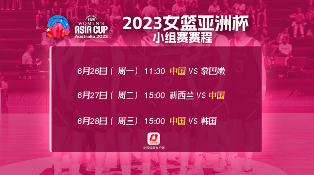 女篮亚洲杯中国队小组赛赛程:6月26日首战黎巴嫩