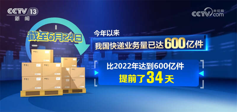国家邮政局数据显示,截至6月24日,今年以来我国快递业务量已达600亿件,比2022年达到600亿件提前了34天。