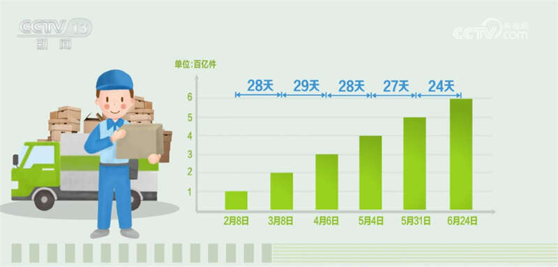 今年以来,从2月8日我国快递业务量超100亿件起,每个月快递业务量都以百亿件为增量。28天,快递业务量从100亿件到200亿件(3月8日),29天达300亿件(4月6日),28天从300亿件到400亿件(5月4日),27天达500亿件(5月31日),从500亿件到600亿件(6月24日)只花了24天。