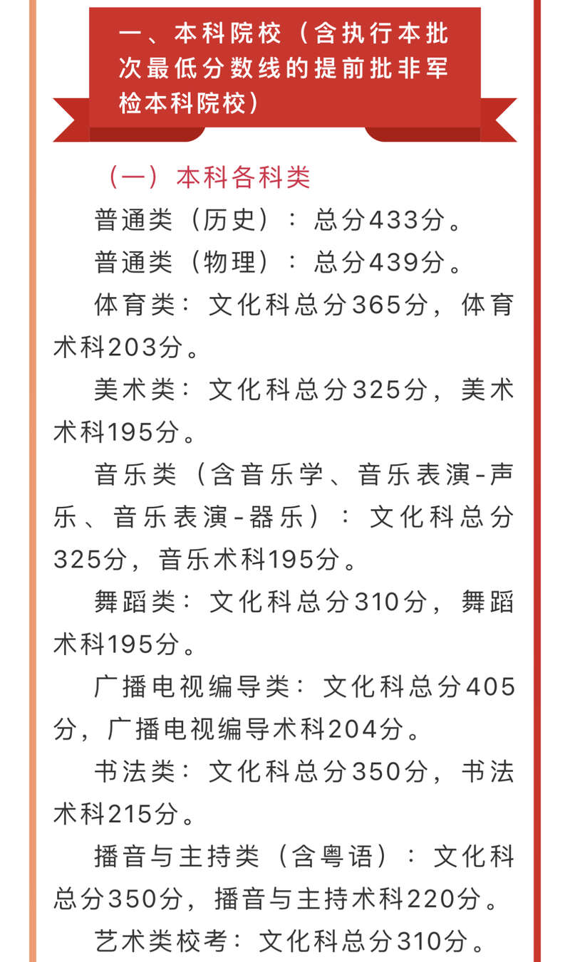 中国青年报客户端广州6月25日电(中青报·中青网记者 林洁)今天,广东省教育考试院举行广东省2023年普通高校招生新闻发布会,公布今年高考各批次录取最低控制分数线。本科普通类历史录取最低分数线为总分433分,本科普通类物理录取最低分数线为总分439分。