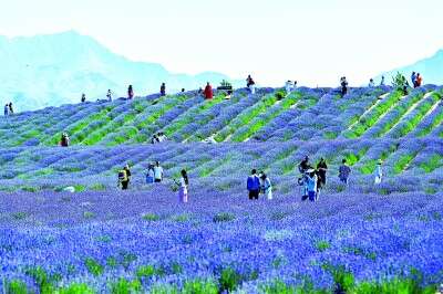 游客在位于新疆霍城县芦草沟镇四宫村的薰衣草农场游玩。新华社发