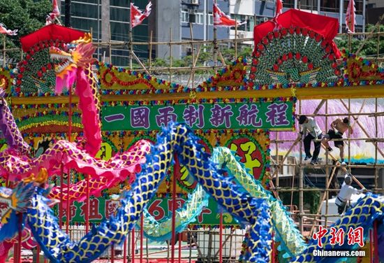 6月27日,香港维多利亚公园内,庆祝香港回归祖国26周年活动场地的布置工作有序进行。