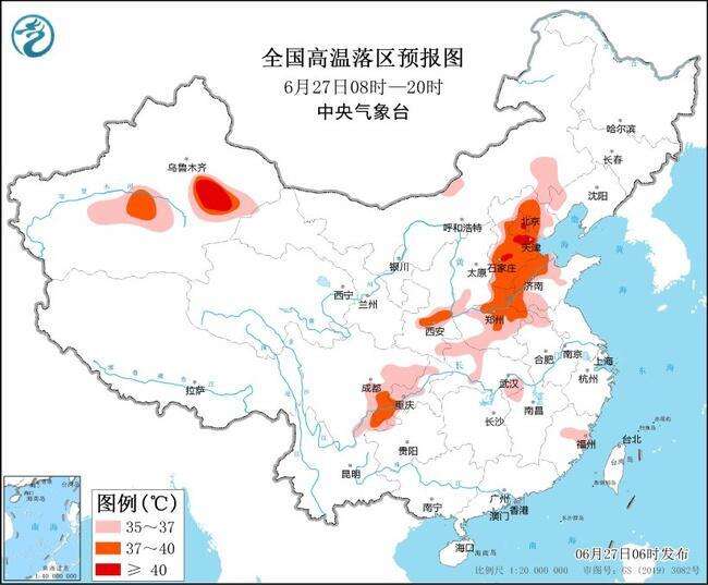 中央气象台6月27日06时继续发布高温黄色预警:预计6月27日白天,华北东部、黄淮、汾渭平原以及新疆、四川盆地等地有35℃~36℃高温天气。其中,北京、天津、河北大部、山东北部和西部、河南中北部以及陕西关中、四川盆地东南部和中部、云南东北部、新疆东部等地的部分地区最高气温有37℃~39℃,河北中部、北京东南部、天津西部局地可达40℃以上。