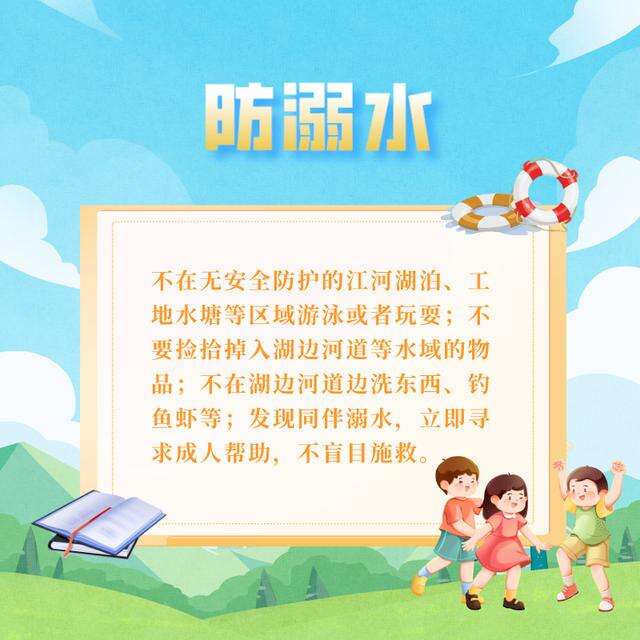2.防溺水:不在无安全防护的江河湖泊、工地水塘等区域游泳或者玩耍;不要捡拾掉入湖边河道等水域的物品;不在湖边河道边洗东西、钓鱼虾等;发现同伴溺水,立即寻求成人帮助,不盲目施救。