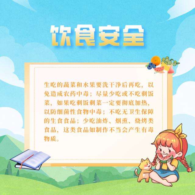6.饮食安全:生吃的蔬菜和水果要洗干净后再吃,以免造成农药中毒;尽量少吃或不吃剩饭菜,如果吃剩饭剩菜一定要彻底加热,以防细菌性食物中毒;不吃无卫生保障的生食食品;少吃油炸、烟熏、烧烤类食品,这类食品如制作不当会产生有毒物质。