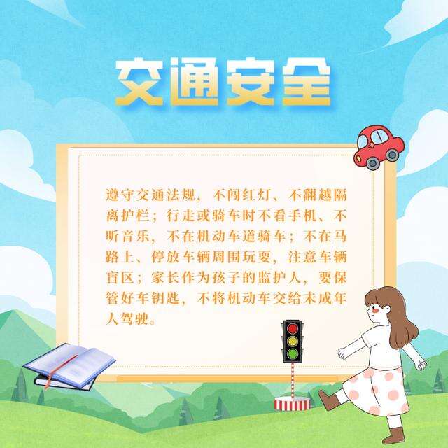4.交通安全:遵守交通法规,不闯红灯、不翻越隔离护栏;行走或骑车时不看手机、不听音乐,不在机动车道骑车;不在马路上、停放车辆周围玩耍,注意车辆盲区;家长作为孩子的监护人,要保管好车钥匙,不将机动车交给未成年人驾驶。