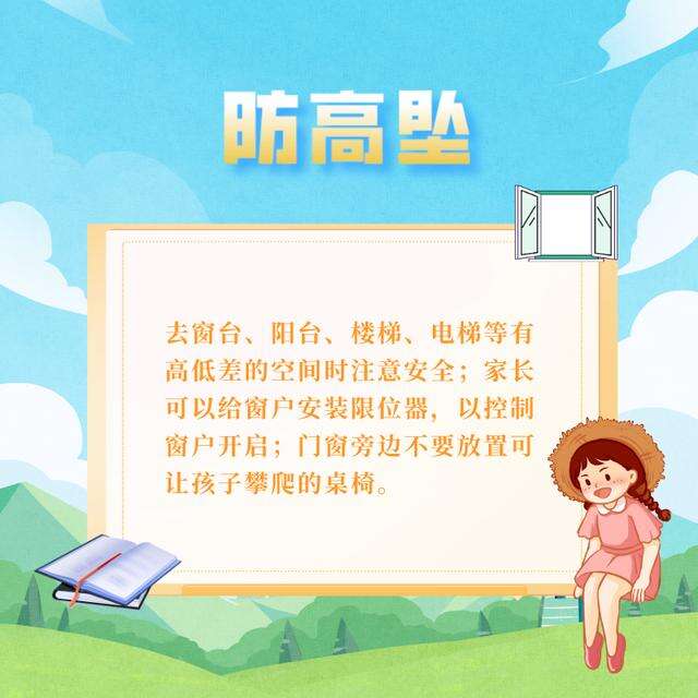 3.防高坠:去窗台、阳台、楼梯、电梯等有高低差的空间时注意安全;家长可以给窗户安装限位器,以控制窗户开启;门窗旁边不要放置可让孩子攀爬的桌椅。