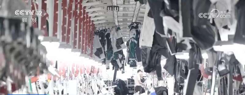 生产车间里,智能生产吊挂传输系统抓取袖口、衣领、前襟等一件件组成服装的“零部件”,精准送到各岗位工人面前,而每条生产线前端的电脑,都会实时记录工人们生产的状态。
