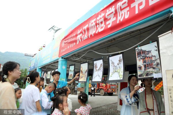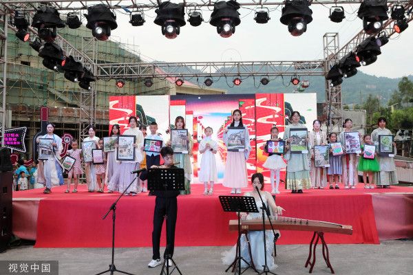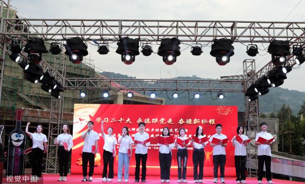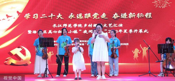 2023年7月7日晚,重庆,“学习二十大、永远跟党走、奋进新征程”——长江师范学院乡村振兴文艺汇演暨涪陵区美心红酒小镇“夜间经济”2023年夏季开幕式在涪陵区美心红酒小镇上演。此次文艺汇演以群众喜闻乐见的本土歌曲和原创作品为主要载体,大学生志愿者们精心编排的艺术党课《赤旗》、武术表演《中华武术魂》、大合唱《涪陵我的家乡》等10多个精彩节目轮番上演,为广大群众带来了一场丰富多彩的精神文化盛宴。 据了解,7月1日至7月7日,长江师范学院长青青——“巴渝文韵”乡村振兴百人艺术实践团以音乐、美术、体育、传媒四个学科为主力,在涪陵区蔺市街道开展暑期“三下乡”活动。活动中,大学生志愿者们以“乡村振兴”为抓手,围绕“激活乡村美育,赋能乡村振兴”为主题,开展了一场健康讲座、一场艺术党课、一系列艺术课堂、一场普通话推广活动、一场趣味运动会、一部地方文化宣传片、一次护河行动、一场书画展、一篇美育情况调研报告、一场乡村振兴文艺汇演等“十个一”行动计划,以推动蔺市街道文旅融合发展。 “以体育人,以美育心”,本次暑期“三下乡”社会实践活动,该校志愿者充分发挥专业知识和技能优势,围绕助力乡村体育、发展乡村美育,开展大学生体育、美育志愿活动,以“体育+”和“艺术+”的思路促进乡村的振兴与发展。