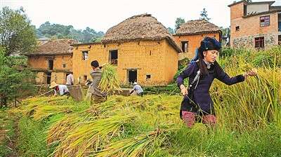 云南省元阳县新街镇上的农民正在收割稻谷。(资料图片)张洪科摄