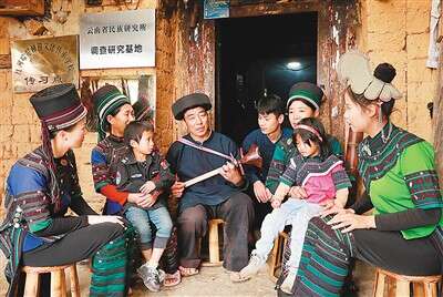 2021年,国家级非遗哈尼族多声部民歌代表性传承人陈习娘(中间演奏者)在和乡亲们交流。胡艳辉摄