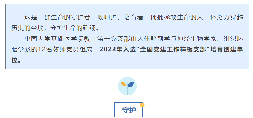 开展遗传资源样本库/脑库建设研究,开展神经损伤与修复、脑发育与脑老化、精神行为与脑等前沿研究……这是展现在中南大学基础医学院教工第一党支部同志们眼前的另一个世界:穿越时空,与历史对话;跨越学科,解生命之谜。如果说,培养优秀的医学生是他们的现实使命,而在这里,他们在窥探生命延续的奥秘的同时,也在延展着自己的生命价值。他们从这里,走出课堂,走向更广阔的天地。