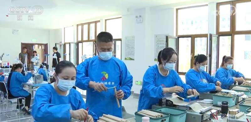在内蒙古鄂尔多斯市文澜社区的艾草园创业就业基地,工人们正在加工艾条、艾草枕头、坐垫、香包等产品。这里的工人都是文澜社区的居民。