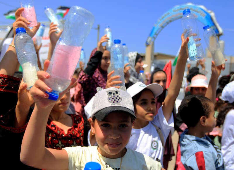 7月17日,加沙城,巴勒斯坦儿童向地中海投掷写有信息的漂流瓶,呼吁结束以色列自2006年以来对加沙地带实施的封锁。视觉中国供图