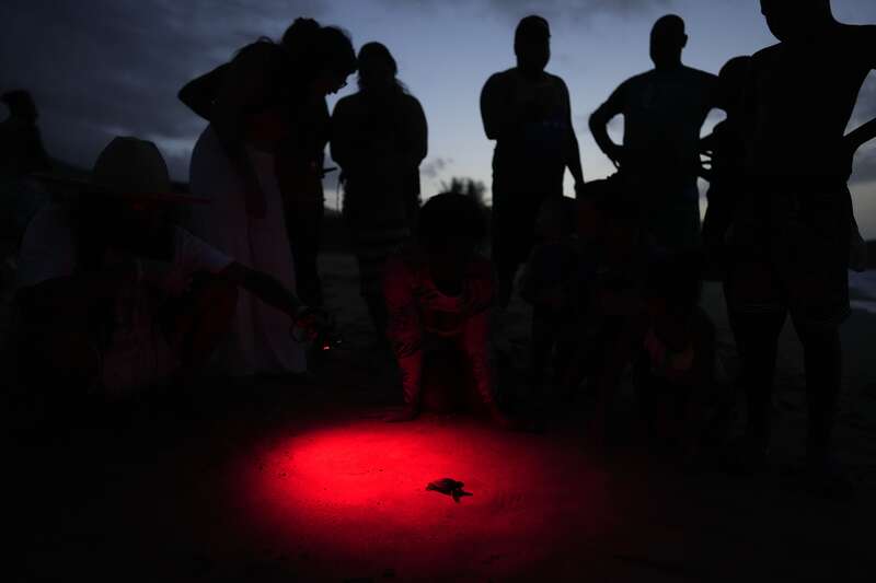7月16日,委内瑞拉一处海滩上,环保主义者放归了一只小海龟,居民和环保主义者看着它走向大海。视觉中国供图