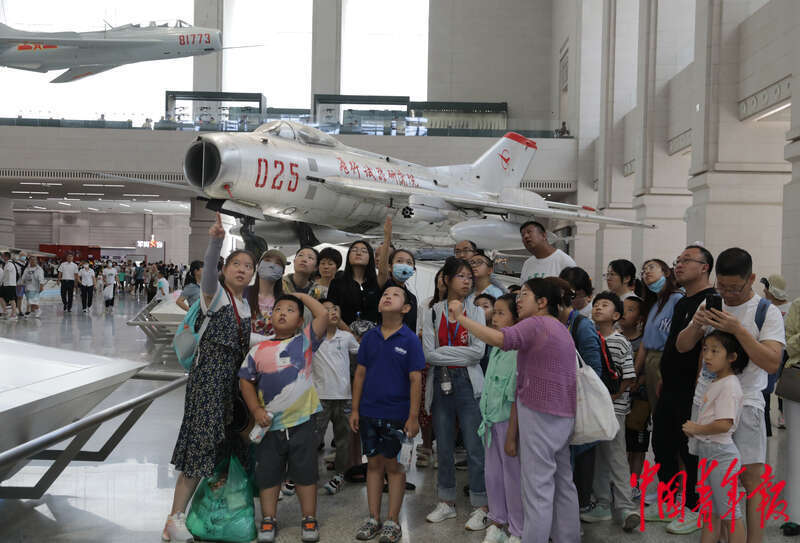 7月18日,北京中国人民革命军事博物馆,家长带着孩子正在听讲解员讲解。暑期来临,不少包括从外地来的家长带着孩子,来到中国人民革命军事博物馆参观,观看军队展览和武器装备,沉浸式学习军事与国防知识,接受革命传统和爱国主义教育。中青报·中青网记者 陈剑/摄