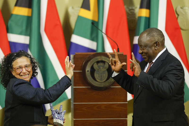 7月19日,南非比勒陀利亚,南非总统拉马福萨(右)和南非国会议员签署《南非手语法案》,将手语定为南非第12种官方语言,进一步保障聋哑人及听障人士的权益。视觉中国供图