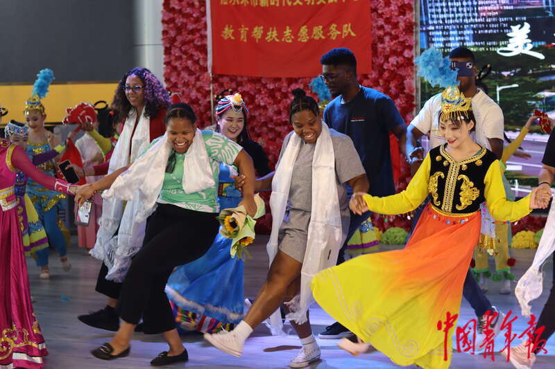 7月21日,青海格尔木市青少年活动中心,加勒比英语国家留学生和孩子们一起手拉手跳起了舞。7月19日至22日,中国人民对外友好协会组织来自巴哈马、巴巴多斯、格林纳达、圭亚那等7国共35名加勒比英语国家驻华使节和留学生参访青海,就当地历史文化、生态保护、绿色发展等展开交流。中青报·中青网见习记者 余冰玥/摄