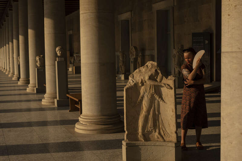 7月20日,希腊雅典古集市,一名游客在阿塔洛斯广场内扇扇子。气象学家警告称,希腊的高温预计将在未来5天内加剧,接近44摄氏度,到7月底,该国将再次遭遇热浪侵袭。视觉中国供图