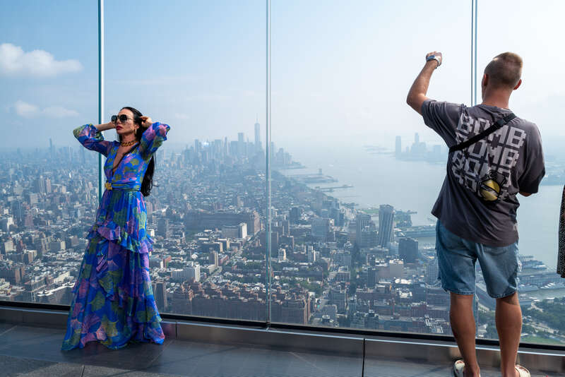7月19日,美国纽约,曼哈顿的一处观景台上,迎接游客的是朦胧的天际线。由于加拿大持续燃烧山火,美国纽约市和新泽西州部分地区仍处于空气质量警报状态。科学家认为这在一定程度上是全球变暖的结果。视觉中国供图