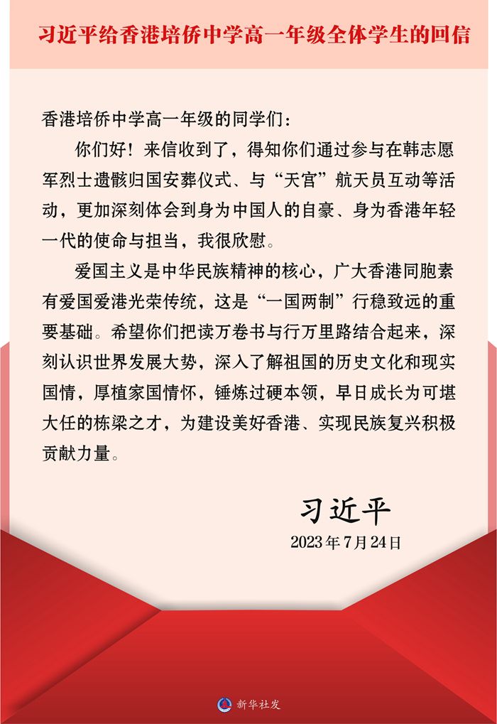 新华社北京7月25日电 国家主席习近平7月24日给香港培侨中学高一年级全体学生回信,对他们予以亲切勉励。