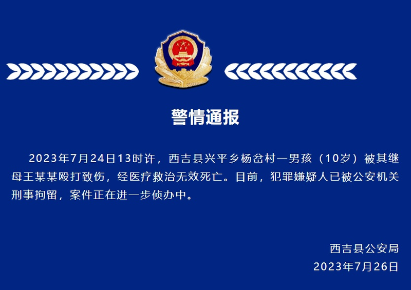 2023年7月24日13时许,宁夏西吉县兴平乡杨岔村一男孩(10岁)被其继母王某某殴打致伤,经医疗救治无效死亡。目前,犯罪嫌疑人已被公安机关刑事拘留,案件正在进一步侦办中。
