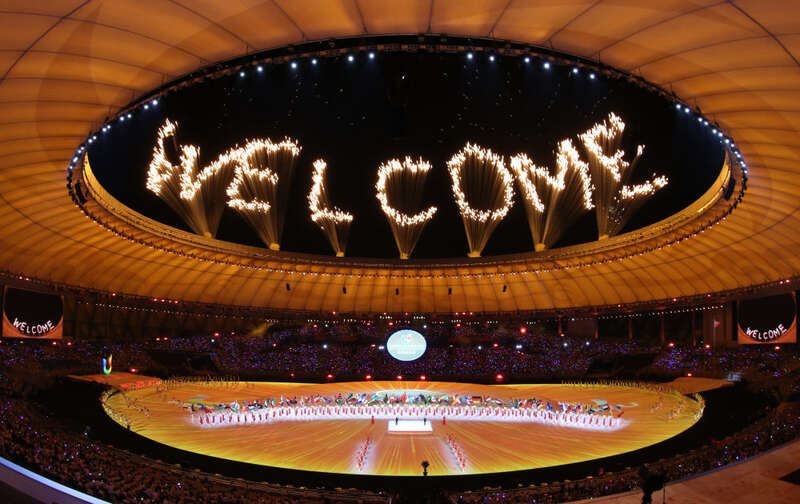 在主题曲《成就梦想》歌声中,道道金色光芒洒向地面,代表参赛国家和地区的旗帜汇聚于场地中央,寓意地球村的居民们沐浴在同一片阳光之下,以包容的胸怀构建和而不同的精神家园。