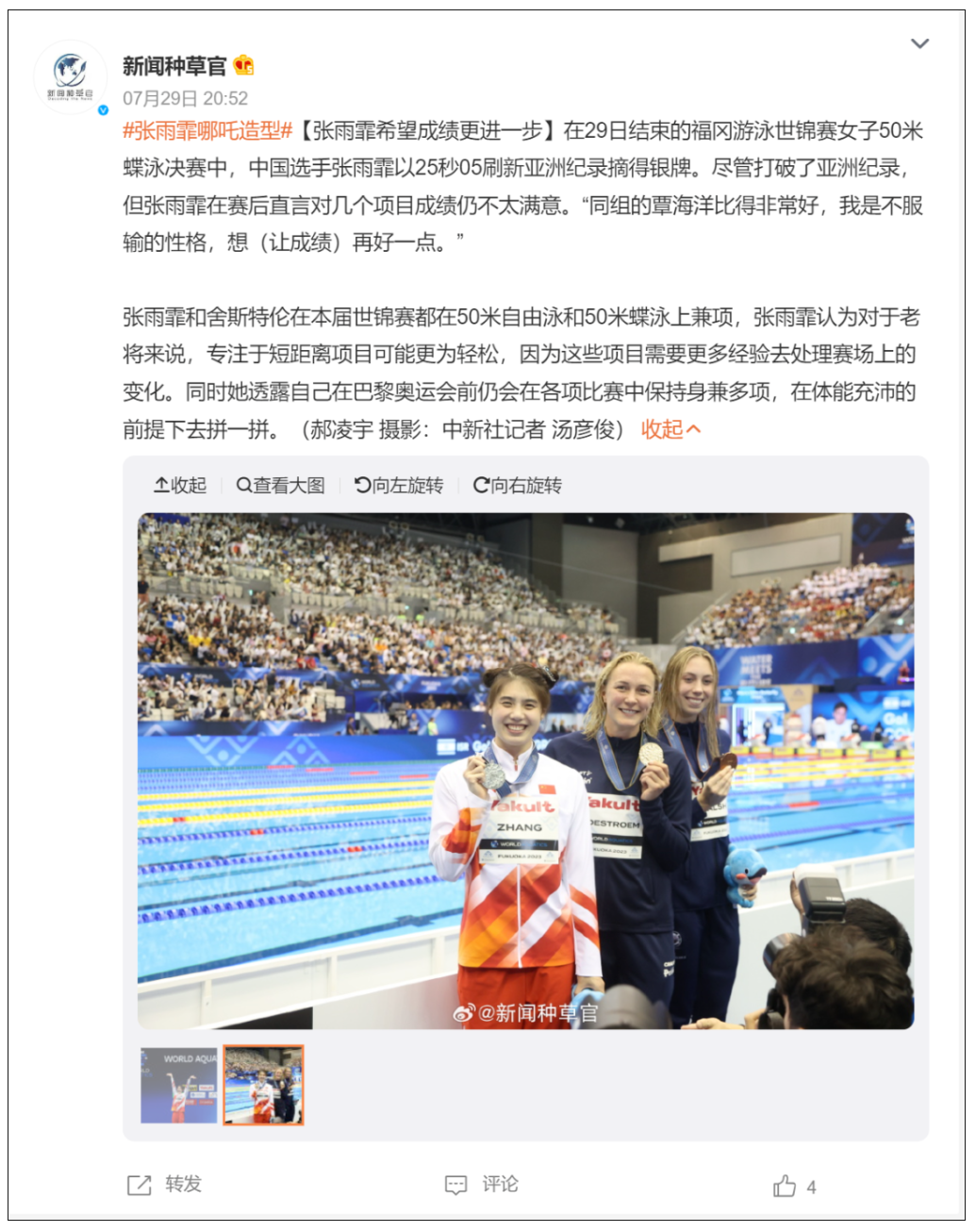 据中国新闻社@新闻种草官 报道,在女子50米蝶泳决赛中,张雨霏摘得银牌尽管打破了亚洲纪录,但张雨霏在赛后直言对几个项目成绩仍不太满意。“同组的覃海洋比得非常好,我是不服输的性格,想(让成绩)再好一点。”