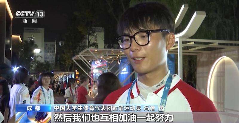 中国大学生体育代表团射箭运动员 冯浩:虽然我们在赛场上是对手,但是我们在场下是很好的朋友,我们平时经常关心彼此的情况、训练,我们也互相加油一起努力,为将来能参加奥运会做好准备,我也很期待我们俩未来会有更好的成绩。