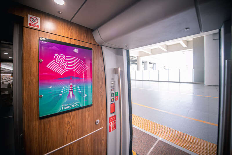 8月4日,复兴号亚运智能动车组车厢门口挂有杭州亚运会海报装饰。新华社记者江汉摄