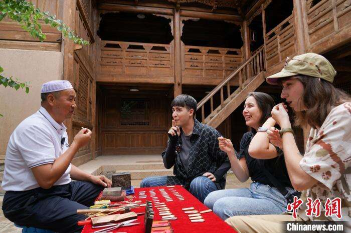 院内,撒拉族“师傅”坐在小凳上,双唇微张,拇指来回翻动嘴边的簧片,演奏出长短高低不一的曲调。外国博主、留学生围坐一旁,尝试动手制作乐器,学习演奏技巧。
