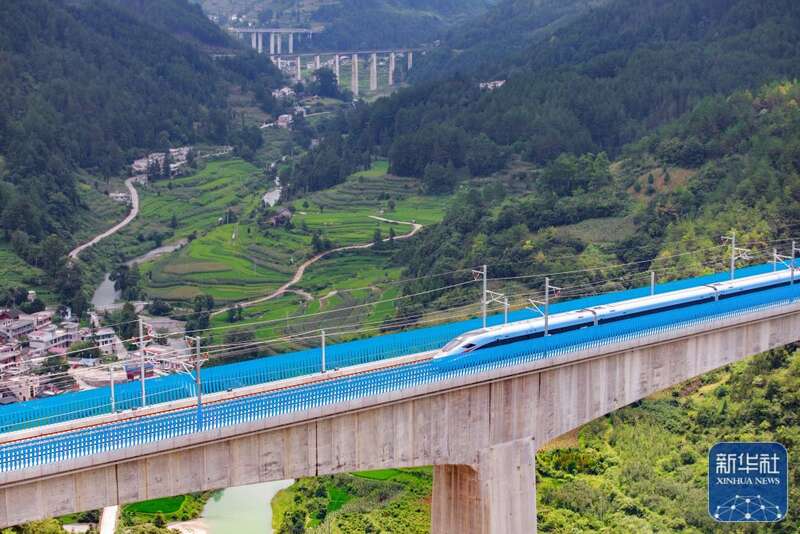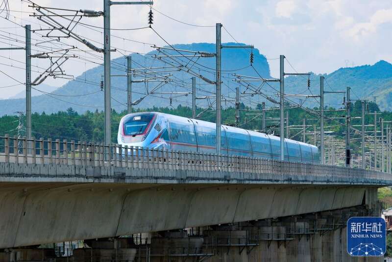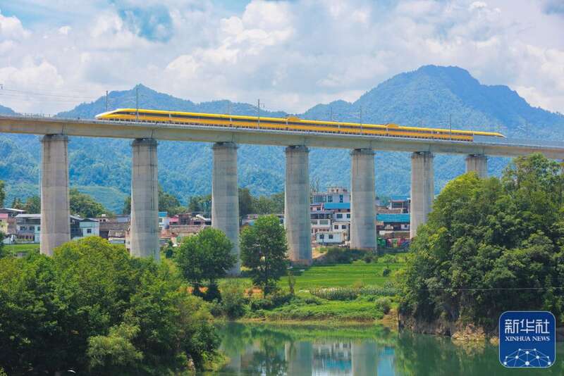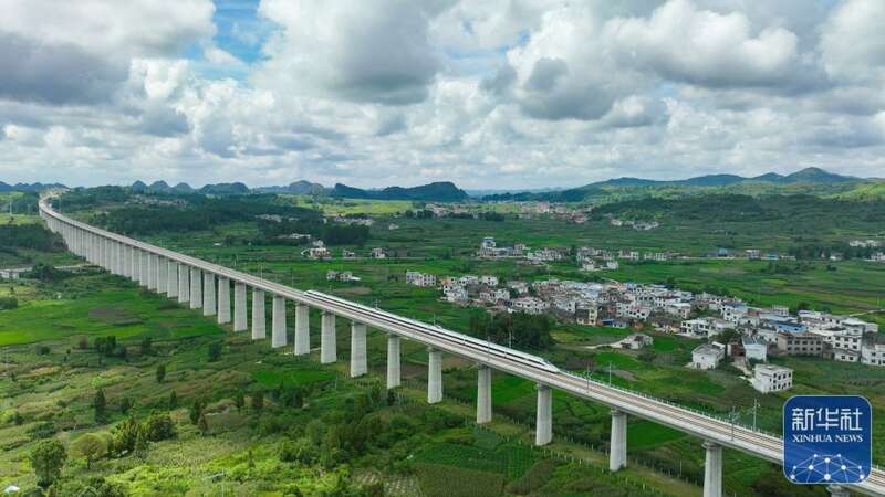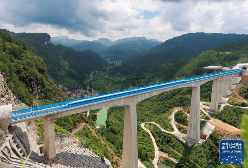试验动车组经过位于贵州省贵定县的贵南高铁桐子园特大桥(8月4日摄)。