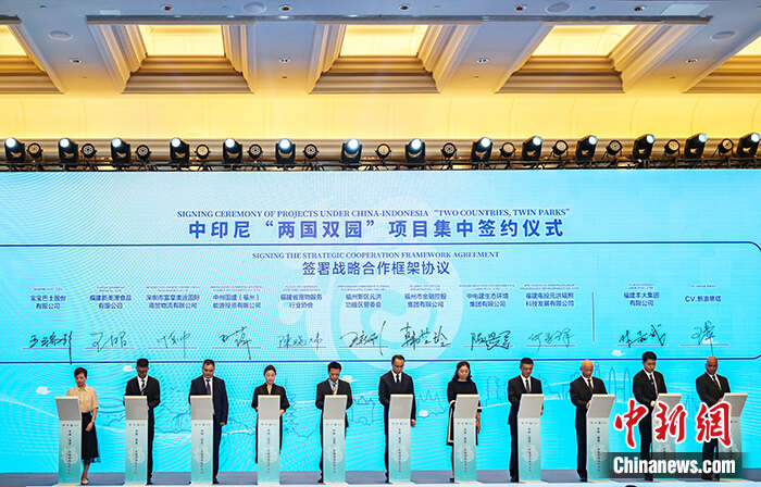 中印尼“两国双园”引进签约了一大批中外合作项目,9个总投资近300亿元人民币的重点项目现场签约,包括福州金控战略合作协议、宠物食品全产业链项目、“两国双园”生态环境提升改造项目、中印尼“两国双园”中国东盟农博城项目等。