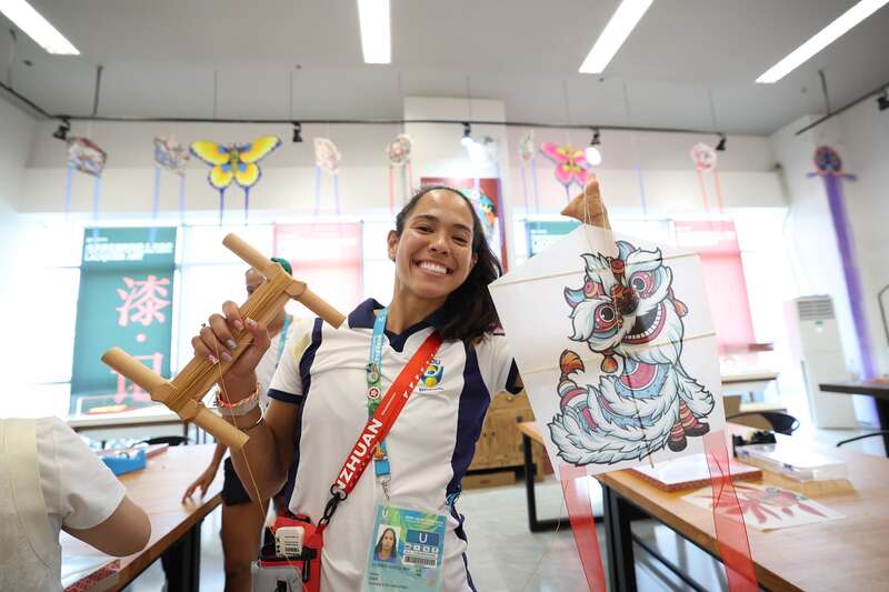 7月31日,成都大运村互动体验中心,外国运动员对风筝爱不释手。