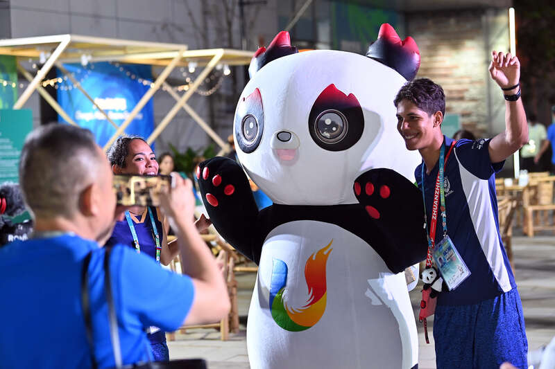 8月4日,成都大运村,本届大运会吉祥物“蓉宝”与大运村“村民”欢乐互动。