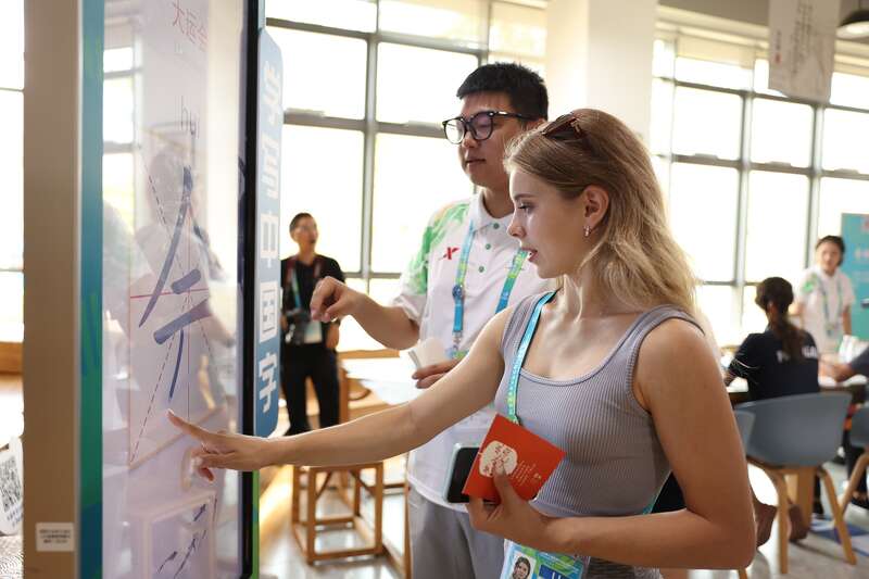 7月31日,成都大运村互动体验中心,运动员在“汉语桥”中文学习互动体验区学写汉字。