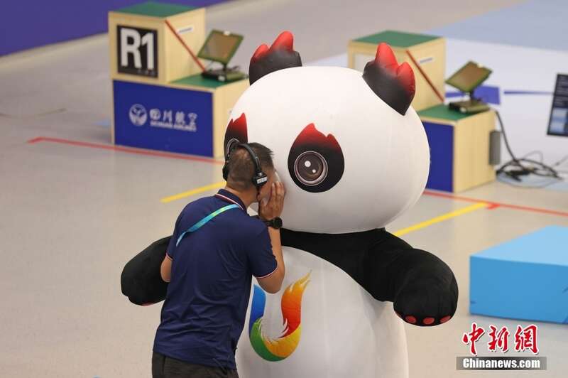 8月2日,在成都大运会10米气手枪混合团体决赛颁奖仪式前,现场工作人员与“蓉宝”人偶沟通交流。