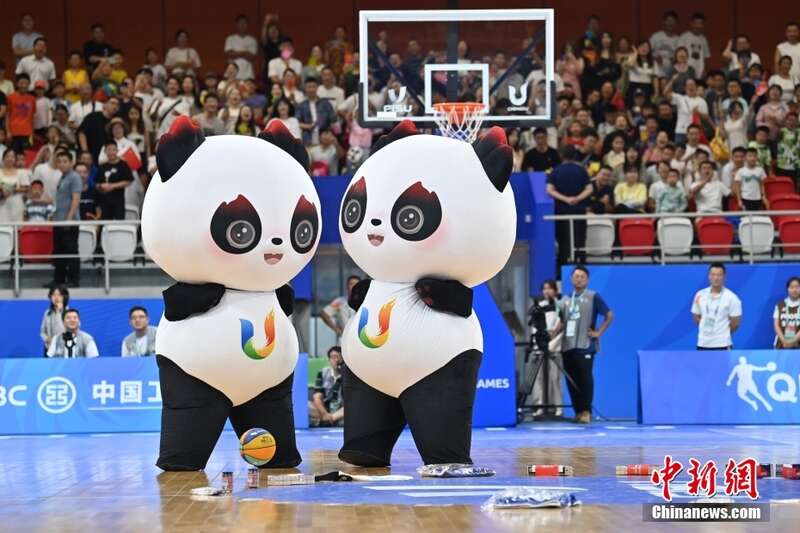 8月6日,在成都大运会男子篮球项目的赛场上,“蓉宝”用篮球与现场观众互动。