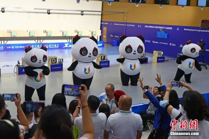 8月2日,在成都大运会10米气手枪混合团体决赛赛场,四个“蓉宝”同时现身与观众互动。