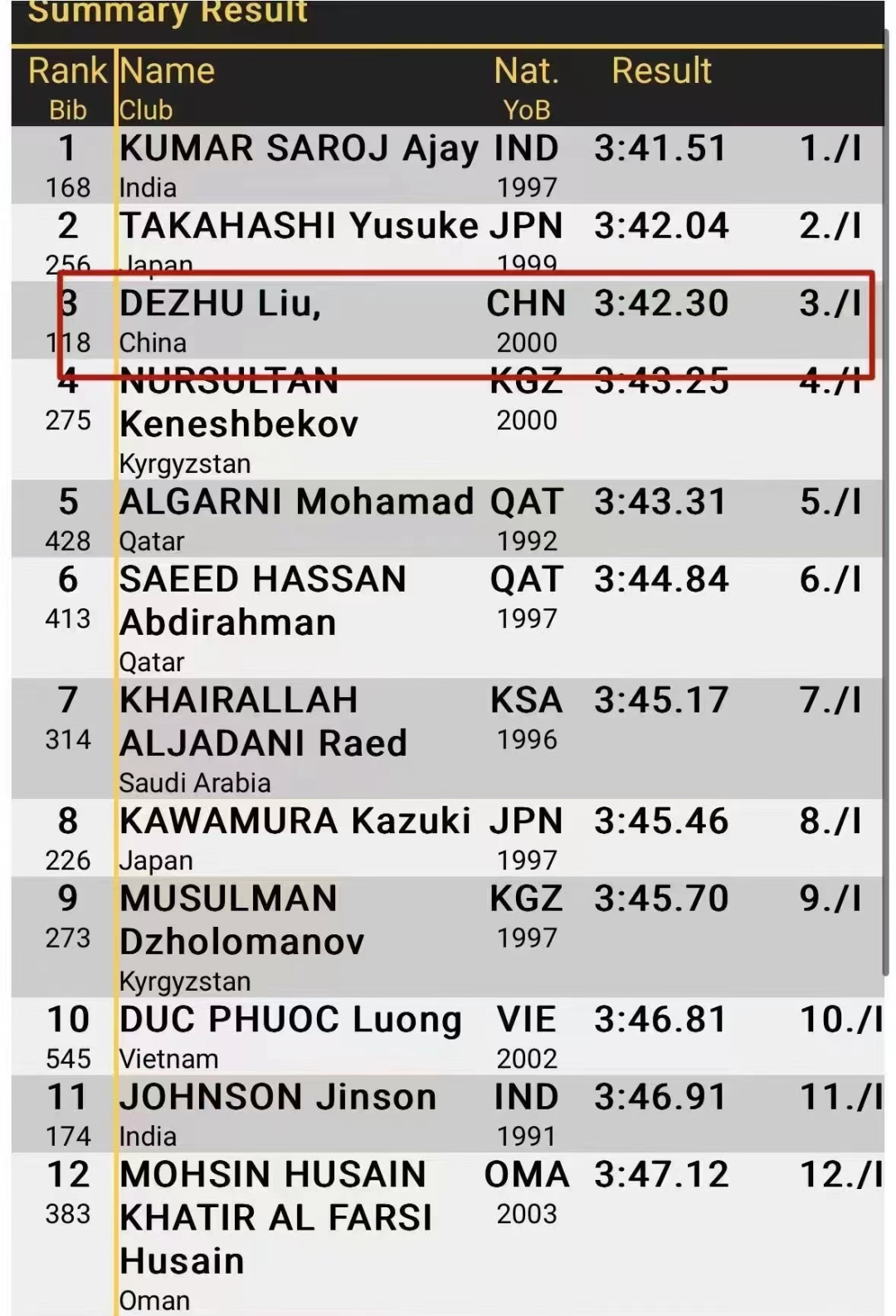 以3分42秒30的成绩摘下男子1500米决赛铜牌