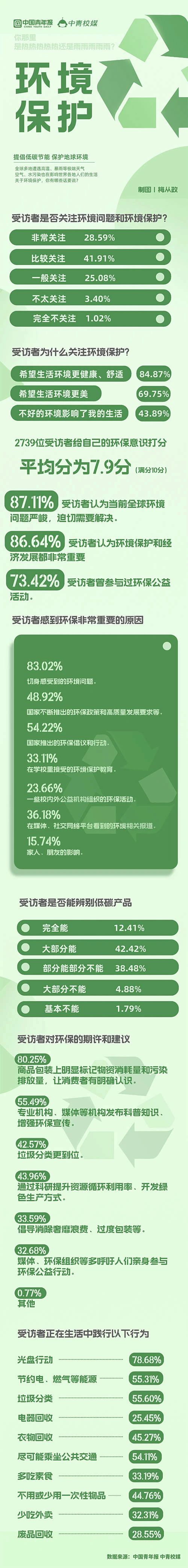 环境问题愈发引起人们的重视,中国青年报社中青校媒近日向全国大学生发起环保意识问卷调查,共回收来自142所高校学生填写的有效问卷2739份。调查结果显示,95.58%受访者关注环境问题,其中28.59%受访者非常关注,41.91%受访者比较关注,25.08%受访者一般关注。受访者给自己的环保意识平均打分7.9分(满分为10分)。