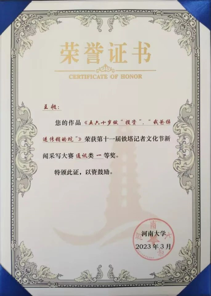 经孙祥飞老师指导,她完成了题为《五六十岁做“投资”,“我爸掉进传销的坑”》的报道。