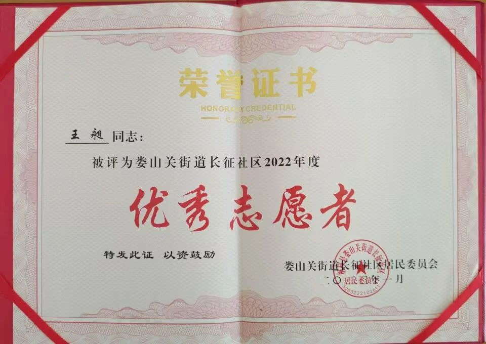 同年9月贵州疫情期间,王昶主动报名志愿者,协助社区工作人员开展疫情防控工作,被评为了长征社区2022年度优秀志愿者。