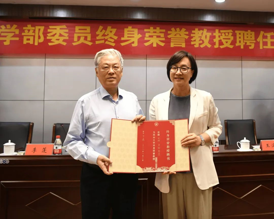 李蓬代表郑州大学向金碚表示感谢和敬意。她指出,金碚先生受聘郑州大学商学院院长以来,带领师生员工,不断开拓事业发展格局,取得了丰硕的成绩。她表示,“大学之大,在于大师之大”。金碚先生是著名经济学家、学界鸿儒,著作等身,在国内外享有盛誉,聘任金碚先生为学校终身荣誉教授,商学院的发展一定日新月异,学科建设必将达到新的高度。她希望全体师生以金碚先生为榜样,厚德崇文,立德树人,接续奋斗,不断推动学校各项工作再上新台阶,为一流大学建设做出新的更大贡献。