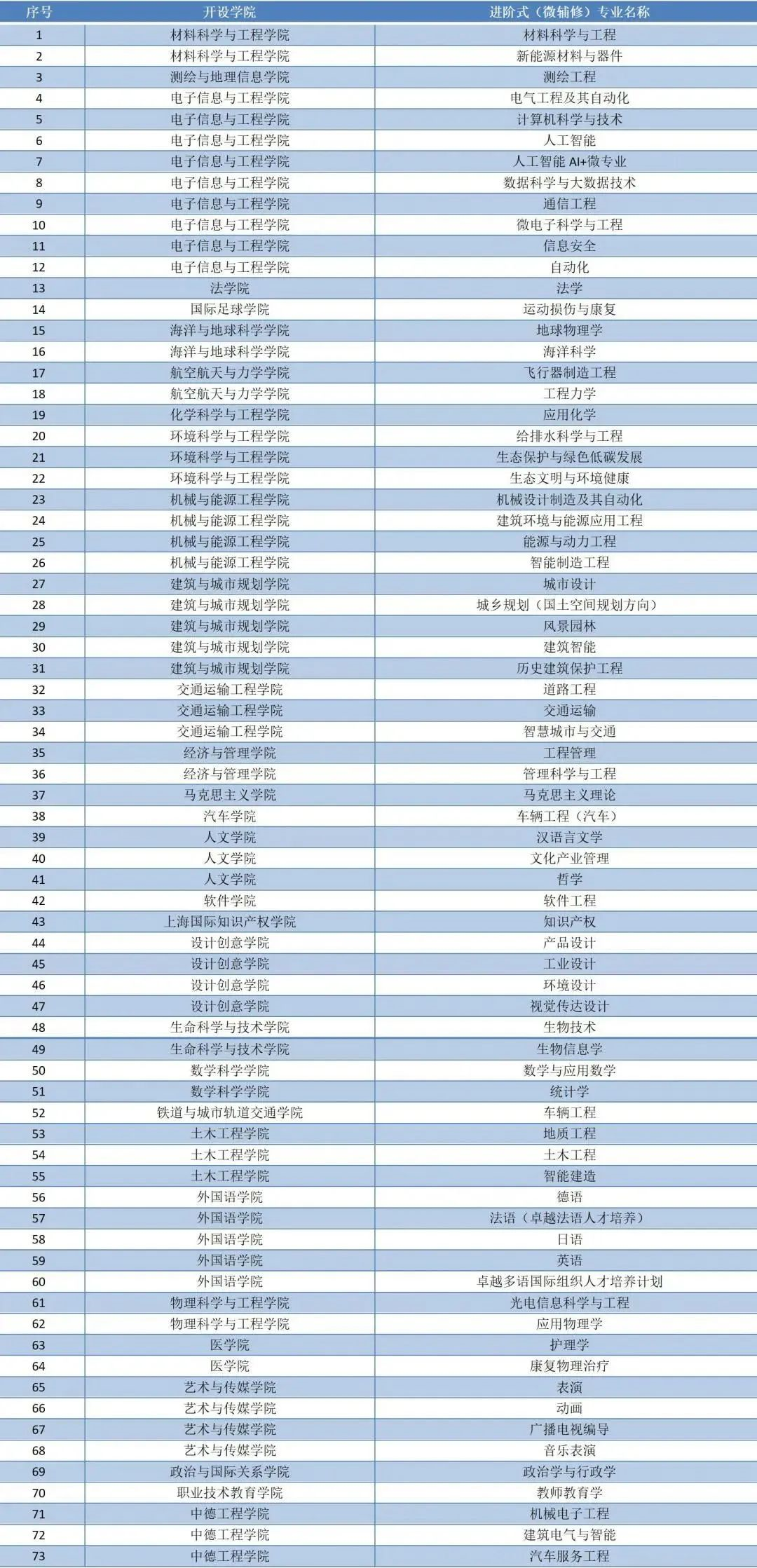 近日,同济大学面向全校本科生发布2023年微辅专业、辅修专业、跨校辅修专业报名的通知,学生反响热烈,报名踊跃。报名将于7月18日14时截止。此次学校全新推出73个进阶式培养的微辅修专业(清单附后),覆盖全校30个学院。