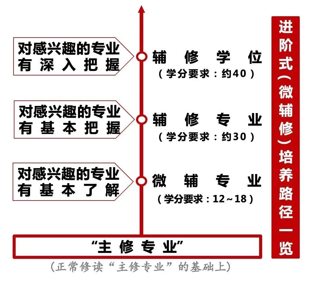 全新升级的进阶式(微辅修)培养,是在学生正常修读主修专业的基础上,根据不同学分要求和对本专业的不同掌握程度,全面铺设“微辅专业→辅修专业→辅修学位”进阶式、一站式、多元化的高质量辅修成长路径,为每一位同学创造“主修+辅修”的个性化学习拓展机会。